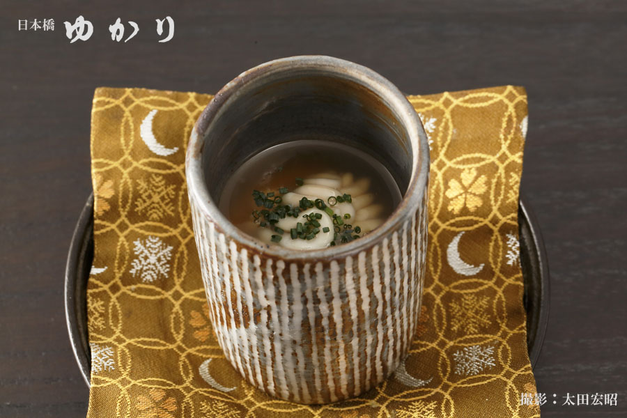 お椀 徳利蒸し 富津産の河豚、江戸東京野菜の千住葱と小松菜、椎茸