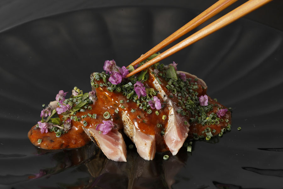 二皿目、戻りカツオのたたき 万能納豆タレ赤黒ブレンド掛け
